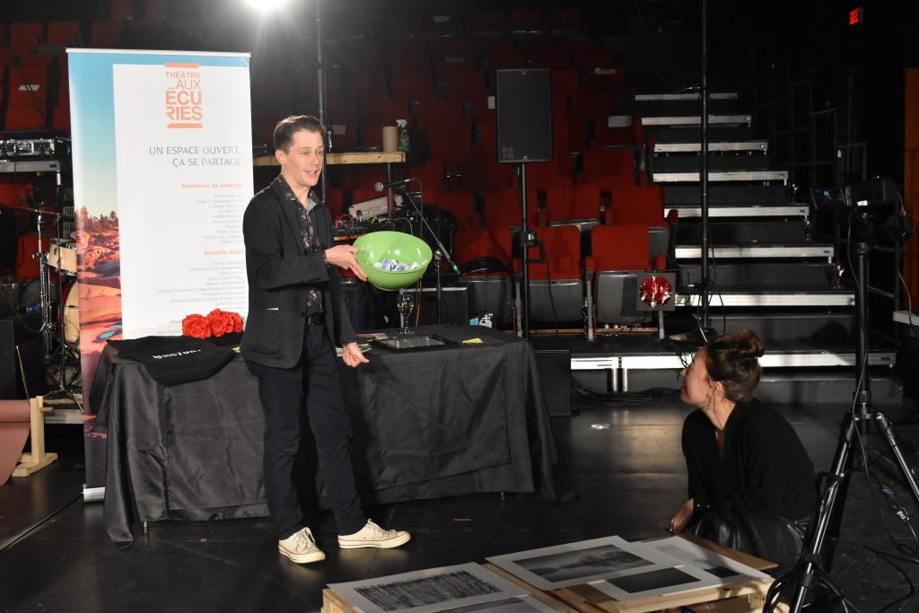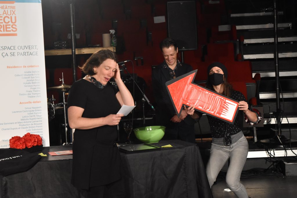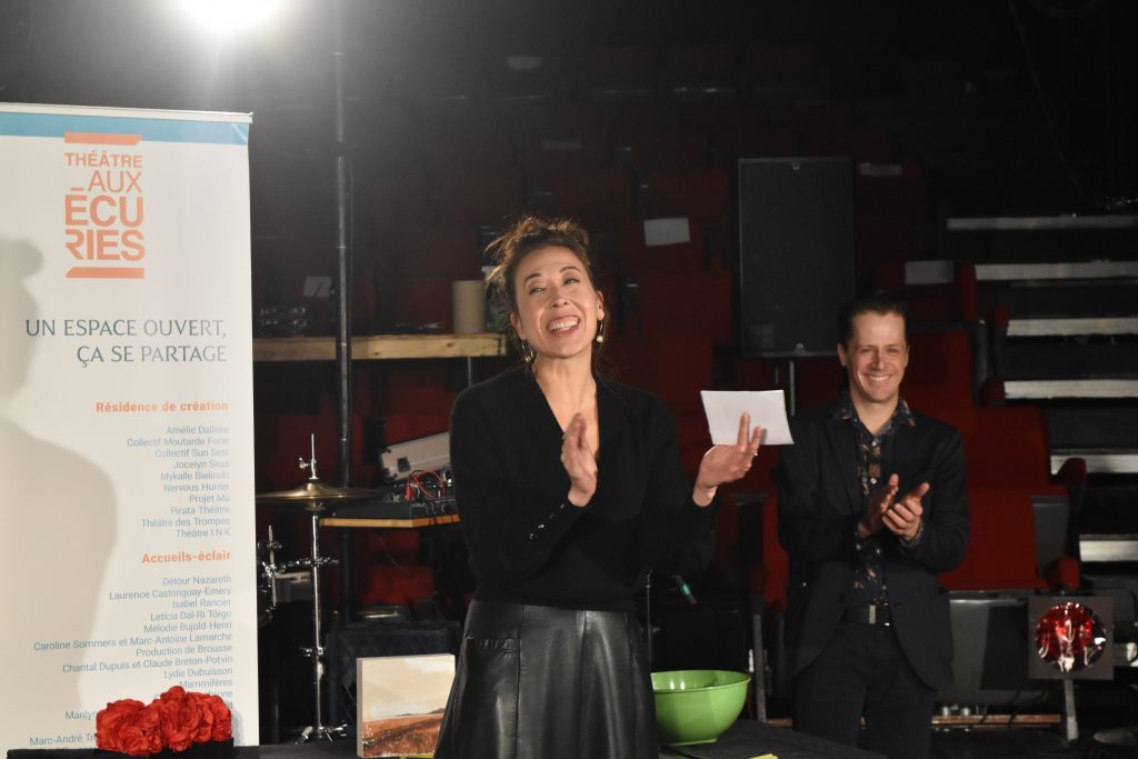 Notre présidente d’honneur, la comédienne Cynthia Wu-Maheux, notre président Martin Carrière (vice-président, stratégie et transactions, EY), et notre animateur, le comédien, auteur et metteur en scène Olivier Morin, nous ont permis de passer une soirée de folie en se réunissant au sein de notre théâtre. En déambulant dans nos différents espaces, ils ont pu nous présenter cinq projets des différentes compagnies théâtrales que nous soutenons, parmi plus de 40 beaux projets qui sont en incubation aux Écuries.