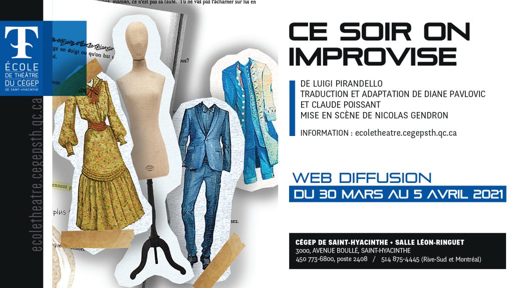 Dans Ce soir on improvise, on fait semblant d’improviser. Les spectateur·trice·s deviennent complices des interprètes de cette pièce qui déconstruit le rapport entre l’illusion et la réalité en révélant les ficelles du théâtre à travers une histoire de désir, de haine et de jalousie. Le texte, adapté en 1994 par Diane Pavlovic et Claude Poissant, nous amène à Saint-Hyacinthe où une troupe d’interprètes répètent une pièce de Pirandello racontant l’histoire d’une famille italienne typique. Une metteuse en scène tente de garder le contrôle sur le spectacle alors que la troupe ne cesse de remettre son autorité en question.