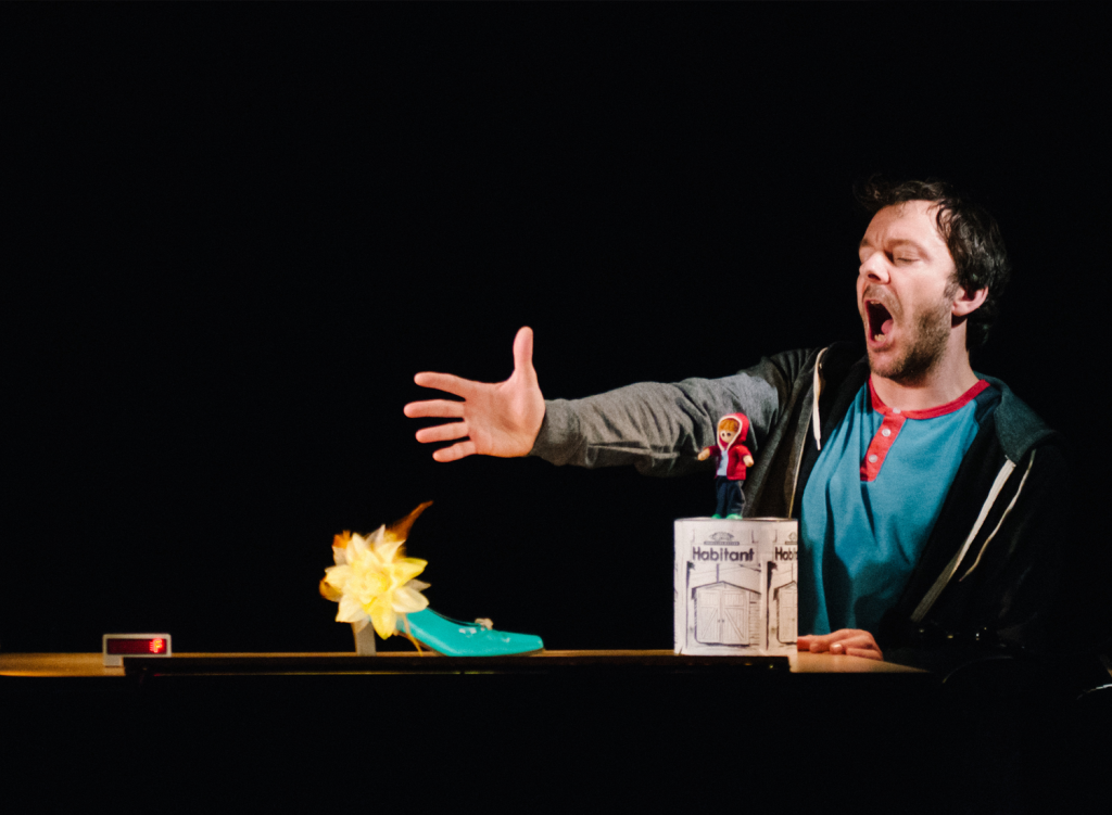 Crédit photo : Charlotte Moffet | Plein Tube est l’adaptation du premier roman d’Hervé Bouchard, Mailloux (Le Quartanier, 2006). Le personnage de Jacques Mailloux raconte des moments marquants de son enfance dans le désordre, toujours en quête d’authenticité. Il témoigne des mises en scène ordinaires de la vie : celle de soi, de la famille, du jeu, du mensonge, du « faire semblant » et de la mort. Il est partagé entre son envie de s’exprimer et son incapacité à le faire. Habité par ses souvenirs, Mailloux trouve sur la scène un espace de jeu, de libération. Ses explorations langagières deviennent concrètes, habitées.