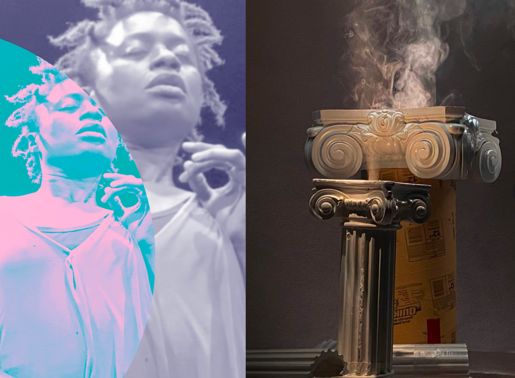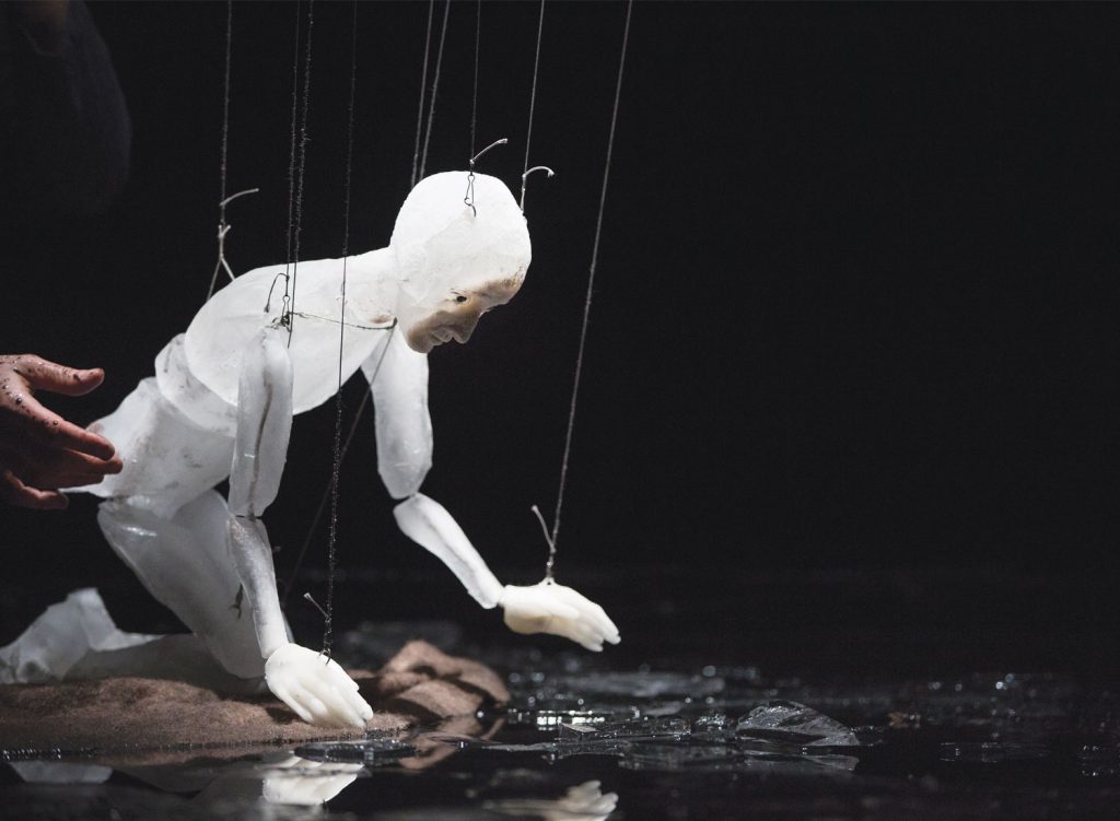 Inspiré par Œdipe sur la route d’Henry Bauchau, ce magnifique poème visuel convie le spectateur à vivre la métamorphose intérieure d’un personnage mythique à travers les différents états de l’élément Eau. Œdipe, marionnette de glace, se transforme peu à peu en eau pour disparaître à l’état de brume. Sa fille, Antigone, assiste à sa disparition.