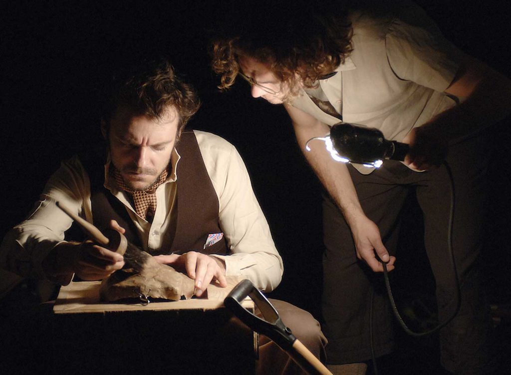 À partir des artéfacts retrouvés sur un site de fouilles, trois archéologues du début du siècle tentent de prouver l’existence du héros mythologique Persée. Mais leur reconstitution historique se heurte sans cesse à des éléments fabuleux. L’enquête scientifique se transforme peu à peu en quête existentielle. Transfigurés par les objets qu’ils animent, ils deviendront, sous nos yeux, les protagonistes du célèbre mythe. Ainsi se développe une étrange cérémonie, tragique et burlesque à la fois. Persée réunit les formes de prédilection du Théâtre de la Pire Espèce : théâtre d’objets et jeu clownesque.