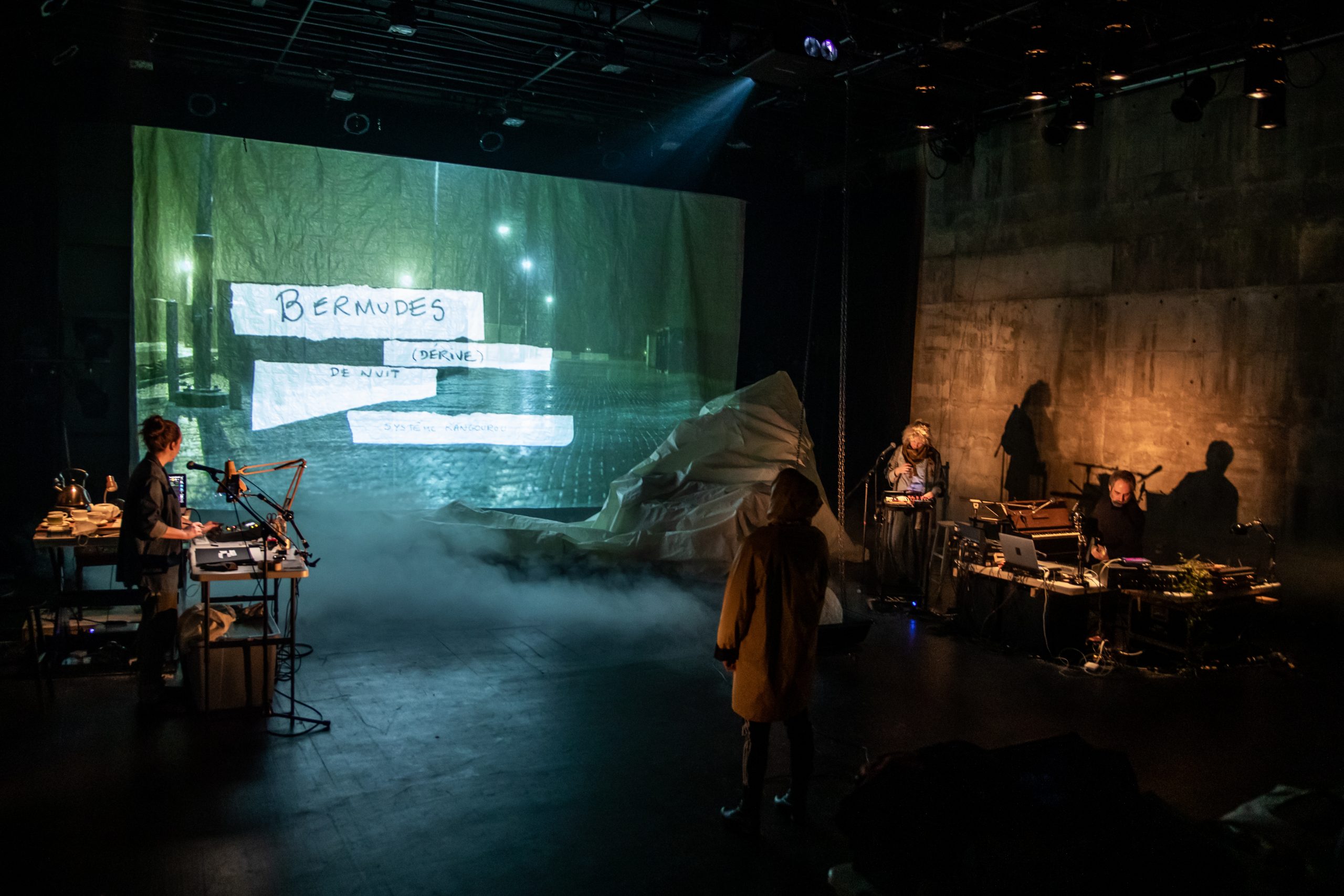 Conçu dans le même dispositif que Bermudes (dérive), précédente création de Système Kangourou, Dérive de nuit en est le verso tout public et se colle au plus près du film Bermudes (nord) de Claire Legendre. Ce spectacle initie le CYCLE DES CÔTOIEMENTS de Système Kangourou qui comprendra trois spectacles interdisciplinaires destinés au tout public.