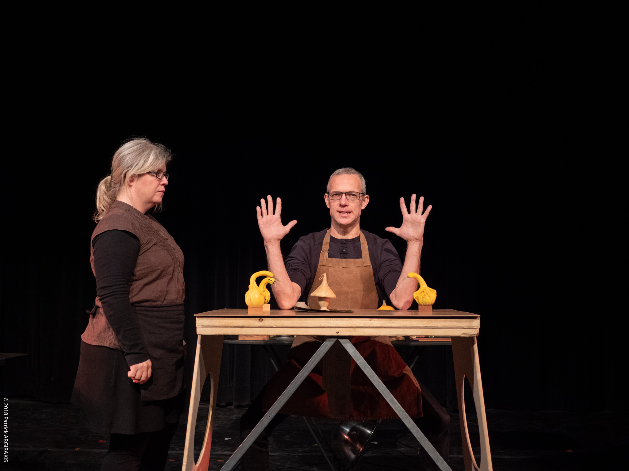 Dans Les contes zen du potager, les héros sont des moines ou des samouraïs; un légume, un fruit ou une petite douceur leur sert de corps, révélant leur caractère. Composé tel un recueil de courtes formes et de haïkus, chaque intervention des manipulateurs se veut aussi assurée et minimale que le geste du calligraphe ou du cuisinier japonais, aussi rituelle que l’art du thé, aussi amusante et inventive que le permet l’art de l’objet!