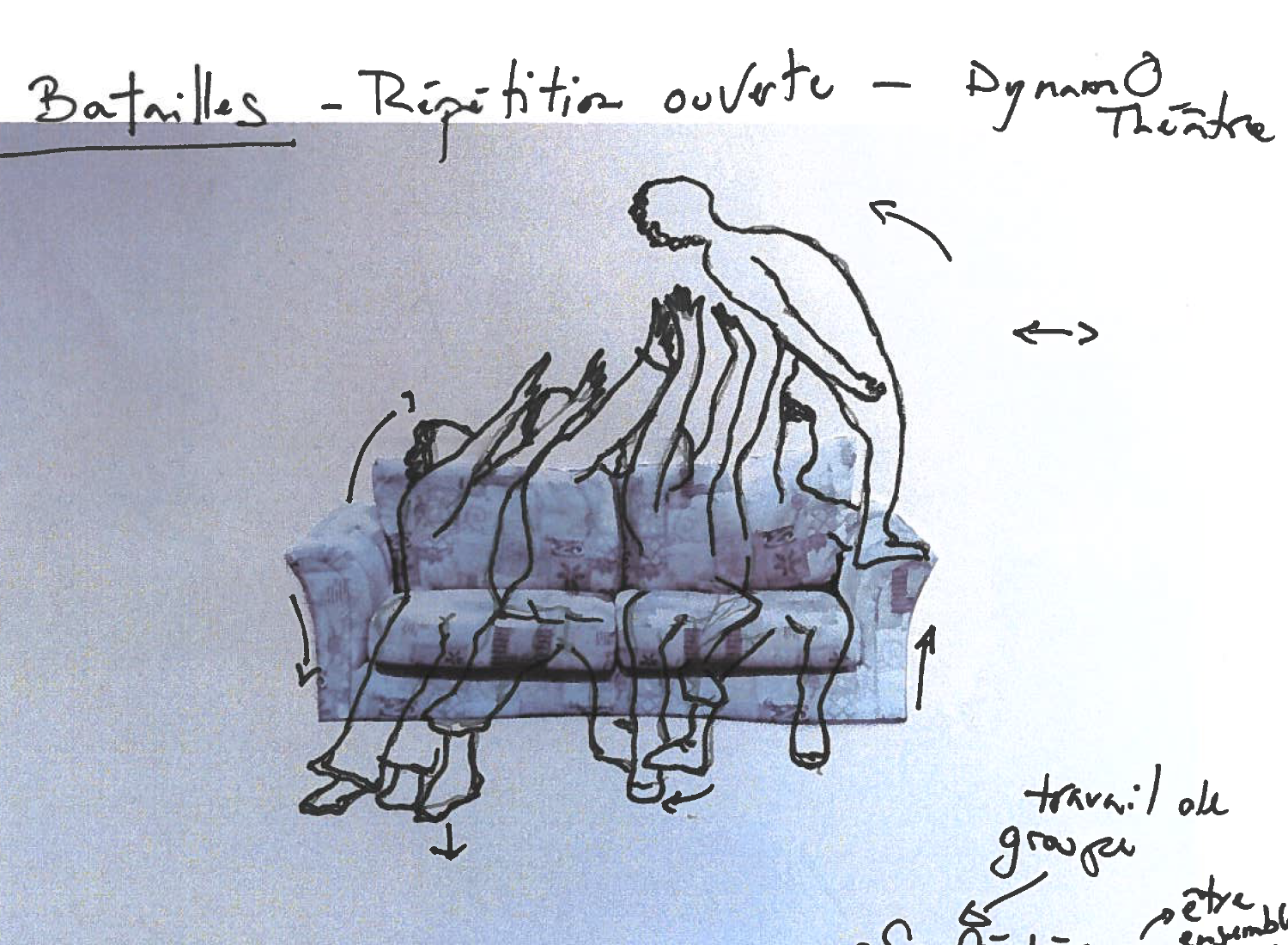 Tout bataille. Les corps, les esprits, les cœurs. Ça chamaille fort, dedans et dehors, seul ou à plusieurs, pour jouer, mais pas toujours. Il est de la lutte comme d’un fondement, un pilier du vivant. Tout ce qui vit, lutte, bataille et la bataille est mouvement. Avancées, replis, affrontements, étendues, expansions, contractions, mains tendues et poings levés, explosions, fuites, esquives, négociations... mouvements. Ils et elles sont cinq, ou peut-être quelques milliards. Quelques individus, uniques avec leur divan comme seul monde, cherchant peut-être le mode d’emploi du groupe. DynamO Théâtre vous ouvre la porte de sa salle de répétition, venez les voir travailler, chercher, explorer en vue de leur prochain spectacle à naître.